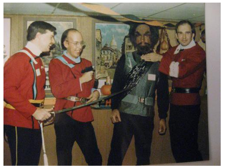 In the above photo I made myself up like a Klingon for a Star Trek club party. That year Mr. Jimmy Dohan was given a sword salute as the bagpipes were played. He was really nice to go along with the Star Trek stuff. He knew we appreciated both his acting and his character. I am not eight feet tall and touching the ceiling. It is a very low ceiling.